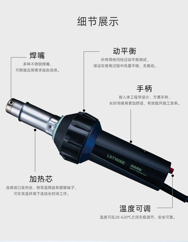 LST1600E是一款便攜、經(jīng)濟(jì)實(shí)用的手動工具,電子溫控連續(xù)可調(diào),溫度控制精度高,性能可靠,結(jié)構(gòu)緊湊,使用壽命長。長時間高溫連續(xù)穩(wěn)定可靠運(yùn)行,具有體積小,重量輕,使用方便等特點(diǎn)。換裝不同噴嘴可以滿足不同的焊接需求,除進(jìn)行焊接外,還可對塑料進(jìn)行熱成型、對接等作業(yè),配合自動焊接機(jī)、擠出式塑料焊槍使用。